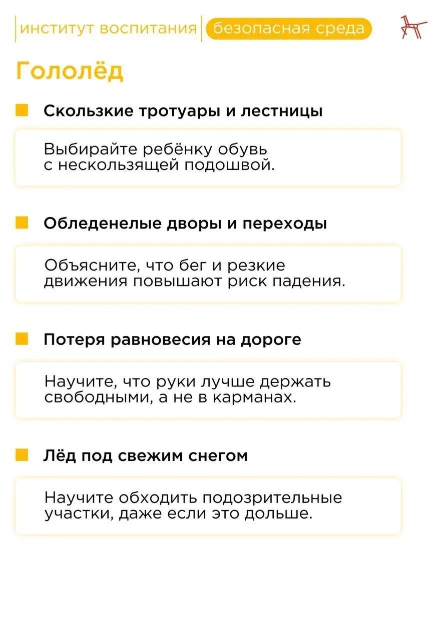 ⚠️ Зимой риск травм увеличивается не только из-за гололёда, но и из-за скрытых под снегом предметов, плохой видимости и работы тяжёлой техники. Важно заранее обсудить с ребёнком правила безопасного поведения.