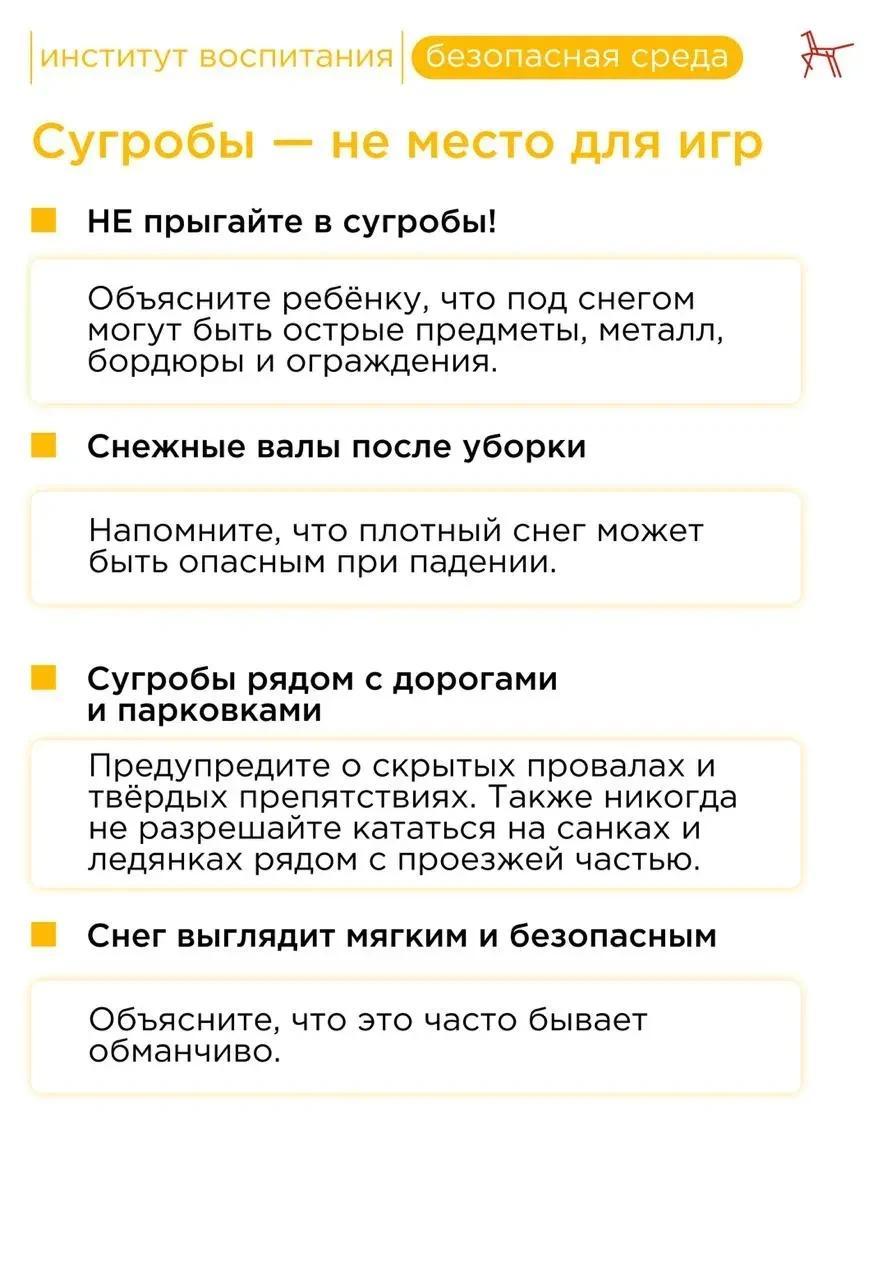 ⚠️ Зимой риск травм увеличивается не только из-за гололёда, но и из-за скрытых под снегом предметов, плохой видимости и работы тяжёлой техники. Важно заранее обсудить с ребёнком правила безопасного поведения.